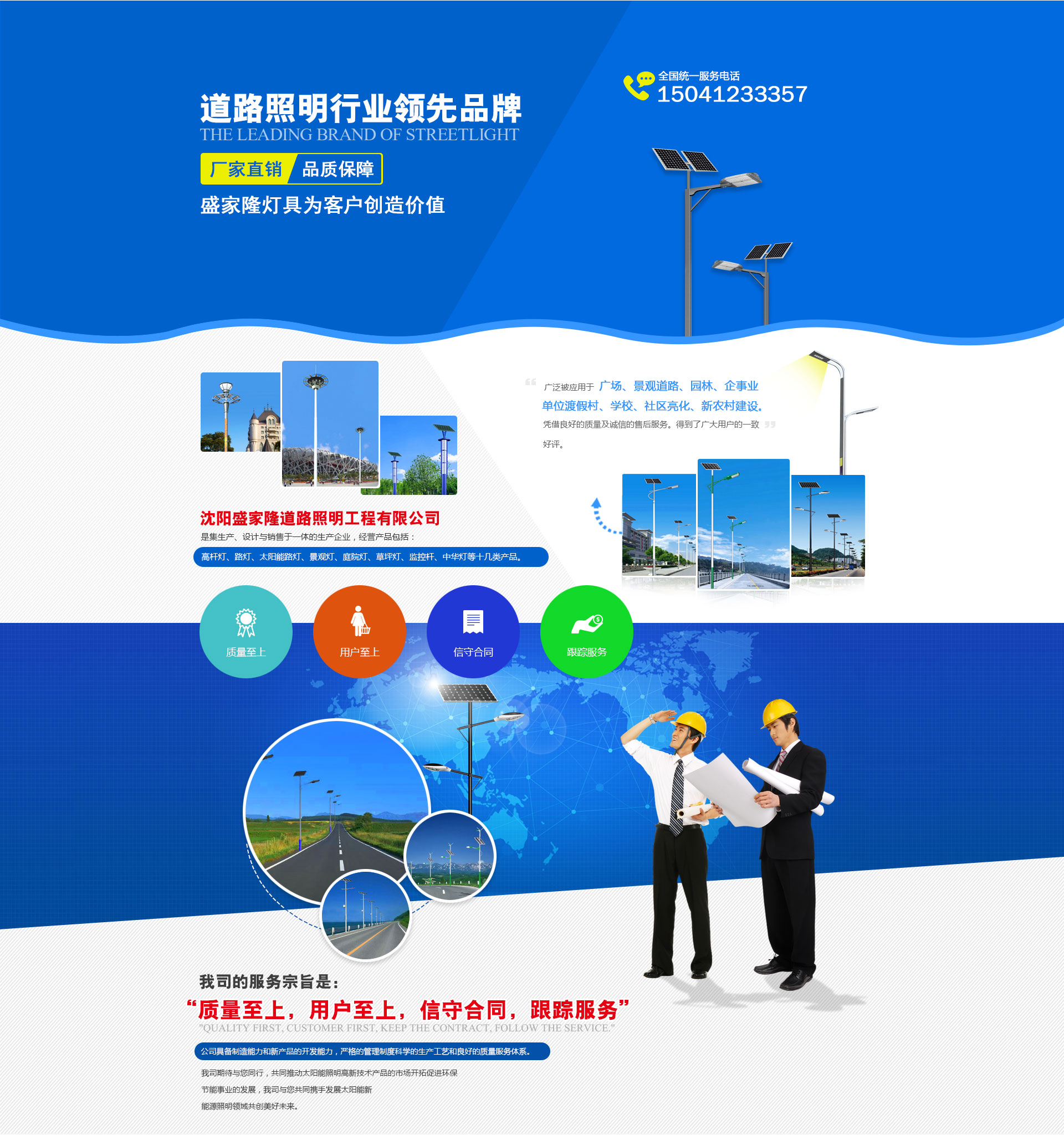 沈陽盛家隆道路照明工程有限公司坐落于沈陽市于洪區(qū)興盛村愛國,生產(chǎn)各種室外,道路,廣場,車站,碼頭,橋梁,庭院及室內(nèi)工礦照明燈具,品種有太陽能路燈,道路燈,LED路燈,組合燈,景觀燈,庭院燈,草坪燈,彩色泛光燈,中高桿燈以及配套使用的各種路燈頭,鎮(zhèn)流器,觸發(fā)器開關(guān)箱等系列產(chǎn)品。 本公司自成立以來,已初具規(guī)模,現(xiàn)有高級技術(shù)人員5人,中級技術(shù)人員28人,研究設(shè)計人員14人,車間工人百余人,并備有大型斬彎機,1600t-900t壓鑄機,20t行吊,高速縱剪機,埋弧自動焊,彩色噴塑線燈先進(jìn)設(shè)備,高科技創(chuàng)造高質(zhì)量,由我公司生產(chǎn)的各種類型的照明燈具,不僅質(zhì)量可靠而且線條流暢,外形美觀,深受廣大客戶的喜愛,長期以來,我公司一直注重產(chǎn)品質(zhì)量,堅持“質(zhì)量是企業(yè)的生命”的宗旨。由于質(zhì)量可靠,價格合理,服務(wù)周到,從而贏得了廣泛的市場聲譽。企業(yè)先后被評為“質(zhì)量信得過企業(yè)”“重誠信守信用企業(yè)”,“AAA級資信企業(yè)”,并通過ISO9001:2000國際質(zhì)量體系認(rèn)證,ISO14001:2004環(huán)境管理體系認(rèn)證,CCC,CQC國家強制性產(chǎn)品認(rèn)證和持有道路照明二級安裝,安全生產(chǎn)資質(zhì)。